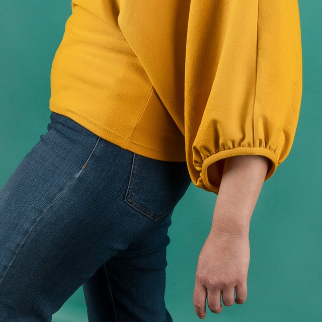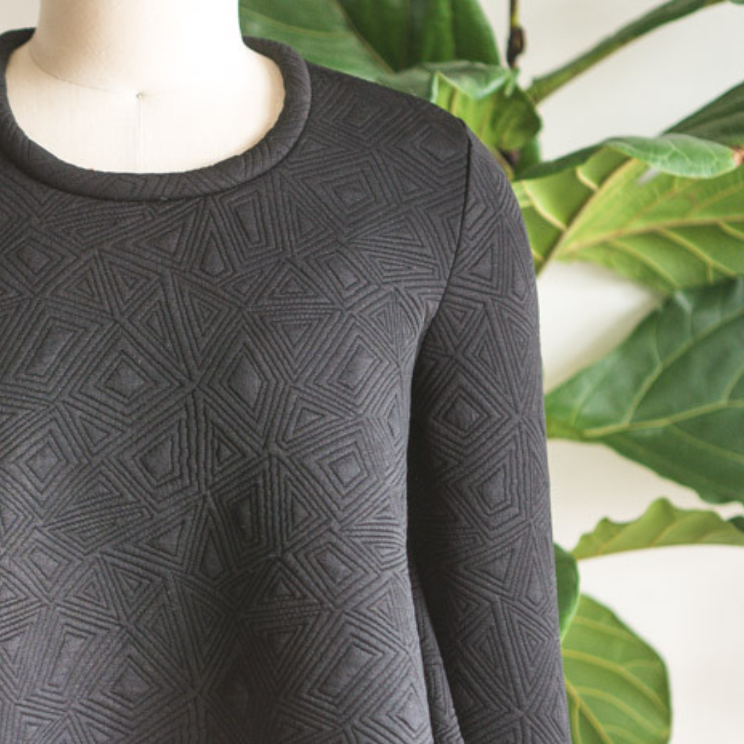 - Fabric - Sturdy knit fabrics with at least 20% crosswise stretch, such as stretch fleece, French terry, ponte, sweater knits, and double knits. If you want to experiment with drapey light to medium-weight jersey knits, consider replacing the bound neckline and cuffs with a traditional knit "t-shirt" band.