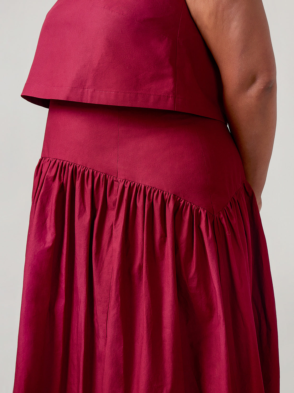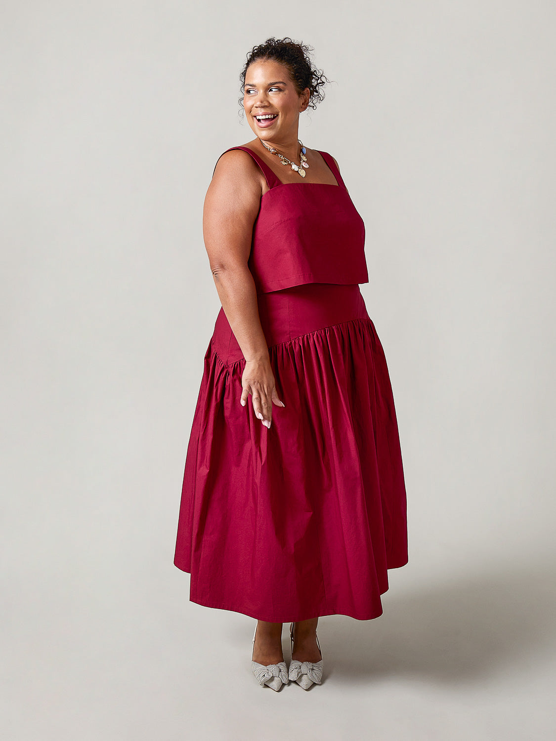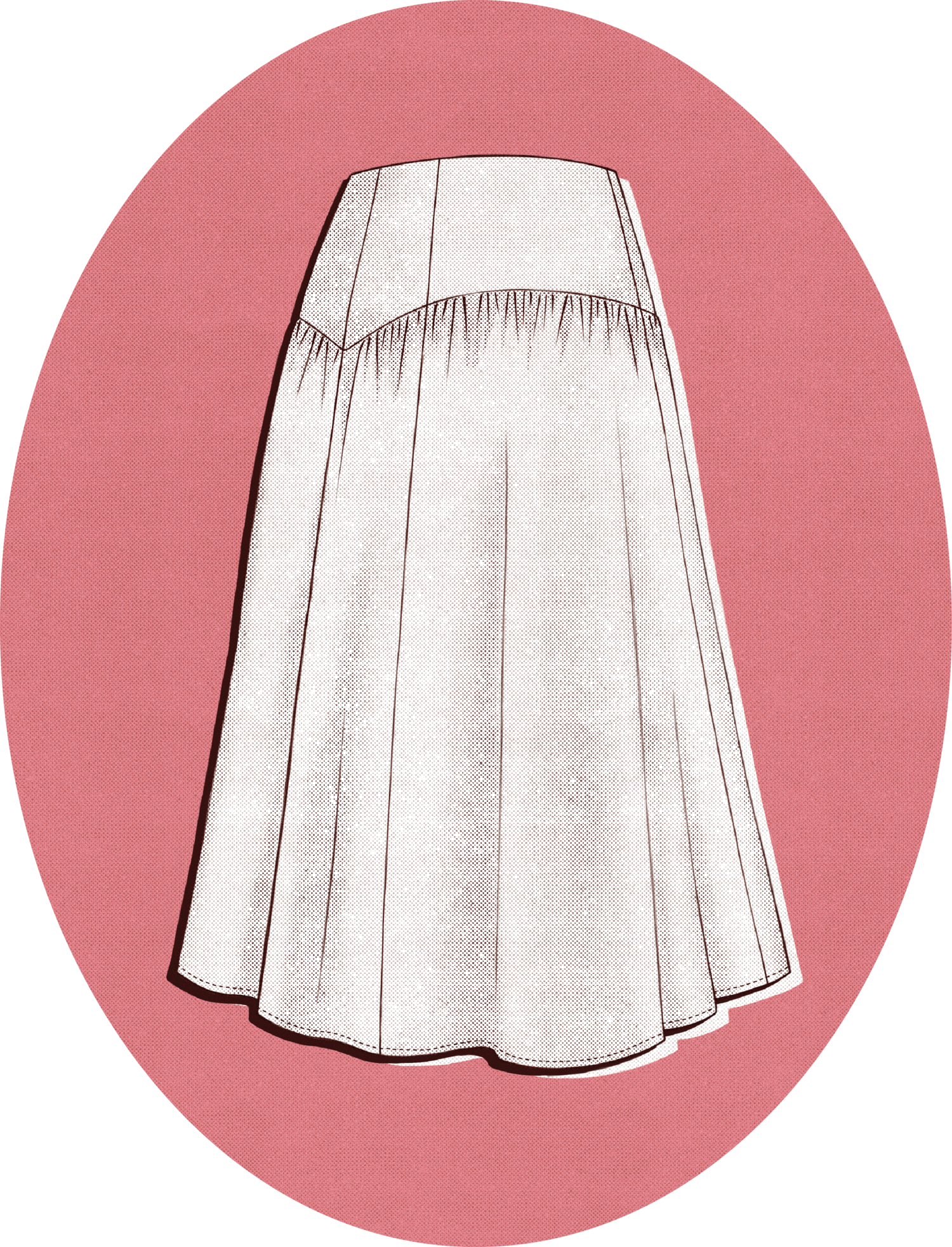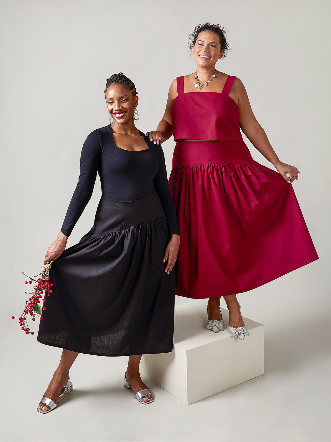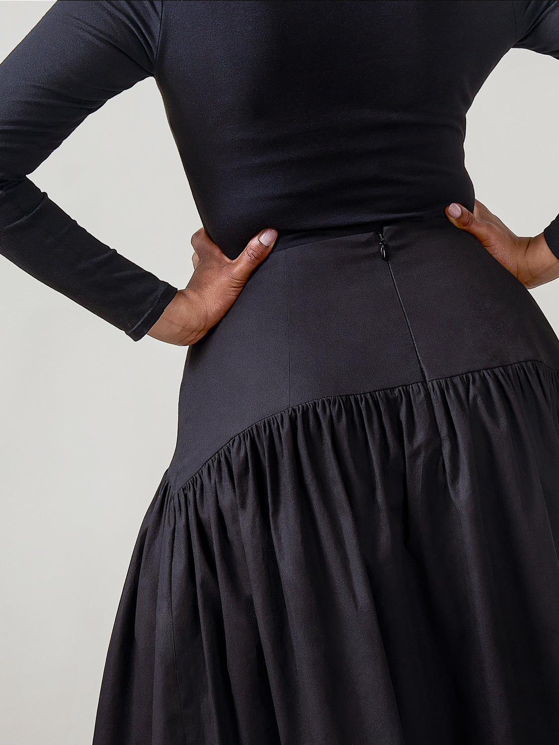 Twirl the night away in Zelda, a drop-waisted 1920s meets 50s meets 80s party skirt. The fitted yoke sits at the natural waist and is finished with a facing for a seamless look. The skirt closes with an invisible zipper at the center back. Gently curving from the center into a point at the side seams, the close-fit of the dropwaist blossoms into a densely gathered midi-length skirt. A beautiful separate to pair with all your tops, it shines in structured wovens that highlight the fullness of the silhouette.