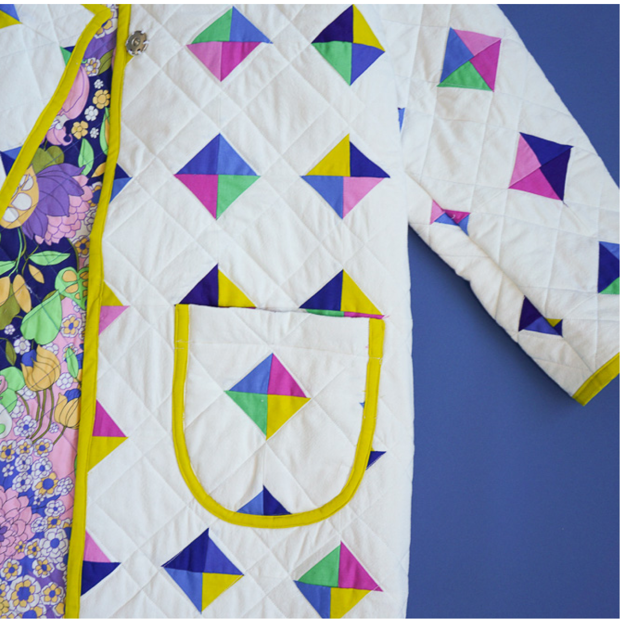 If you’ve never quilted or applied double-fold bias tape before (or if you want to make yourself a coordinating accessory!) we suggest testing your technique with one of our free patterns! You can make a matching dog coat, or use your scraps to make a cute potholder or eye mask! All patterns are available in our Sewing Resource Library using the password “sewjo”.