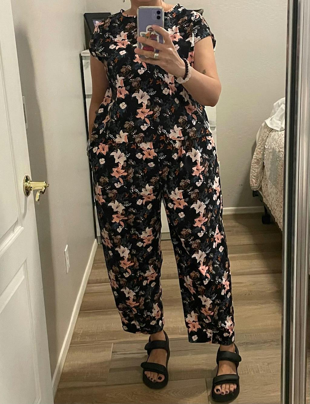I selected this pattern to make a matching barrel pants and top printed set like I have been seeing on social media. I had some pretty floral cotton in my stash, which was a great choice for these pants. The paper bag waist is fun and comfortable. I installed side pockets because I wanted a more streamlined look. I will be making these pants with the front pockets in a solid color soon.