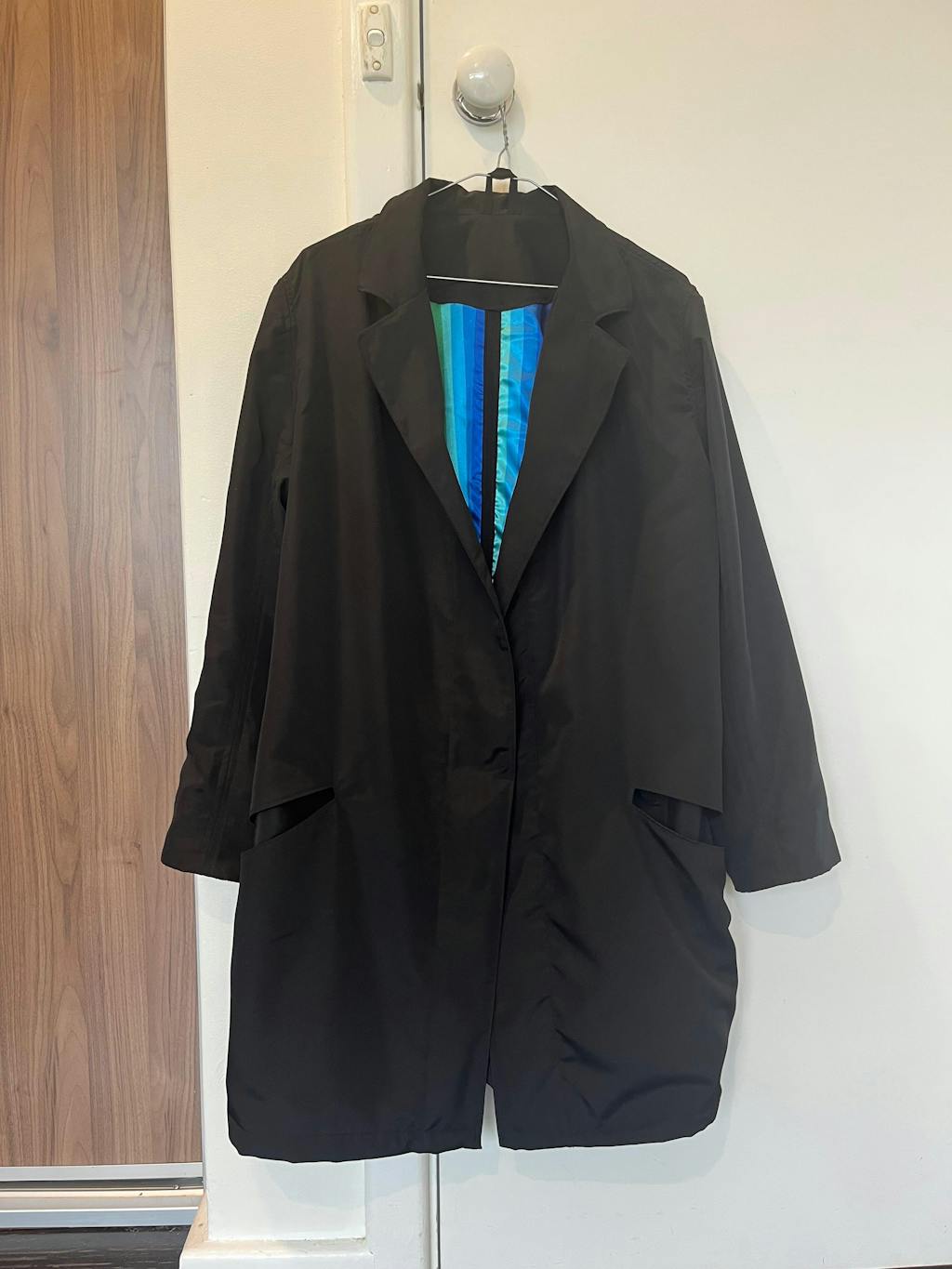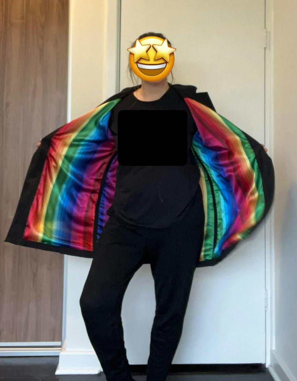I’m thrilled with the jackets I made from this pattern! Checkered version was my test fit, which worked out well. Black jacket is for great for work, with the surprise rainbow lining (sewn as one piece with main fabric).