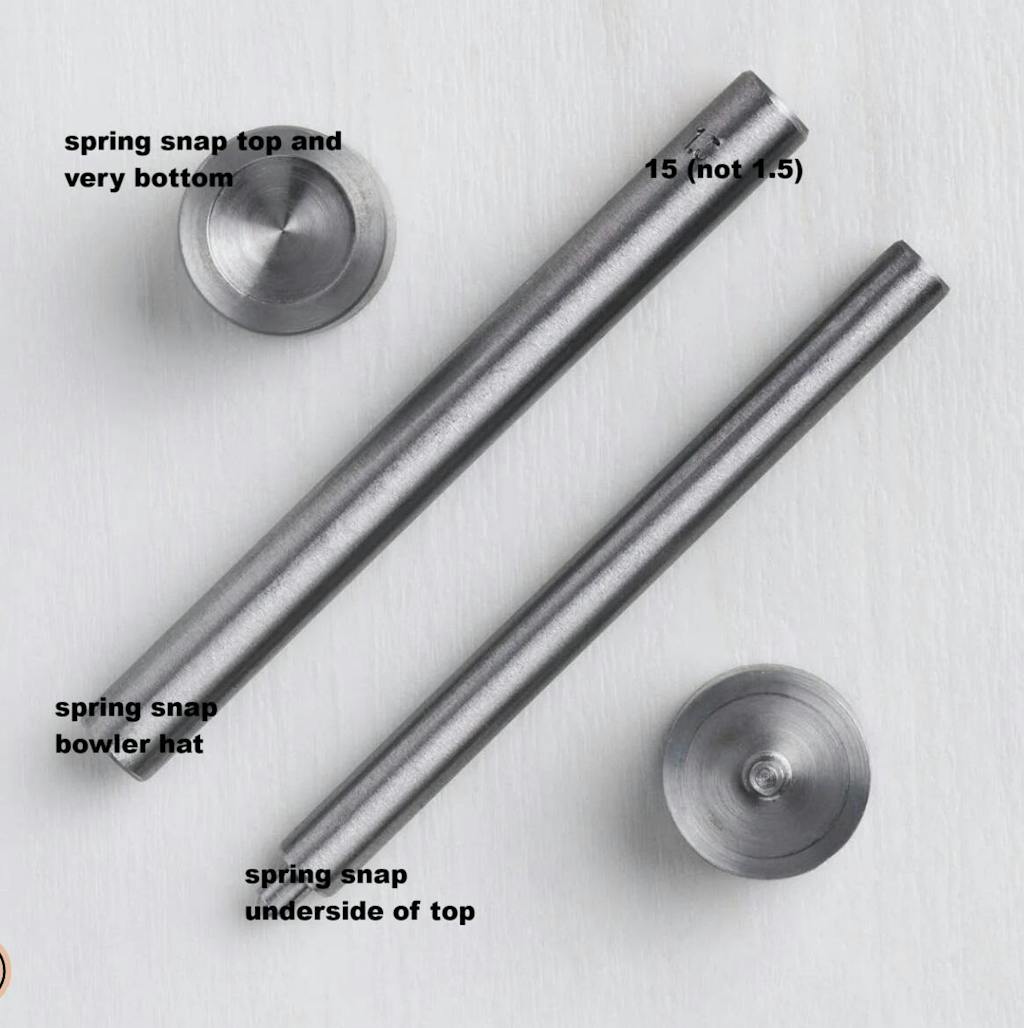 Tailor-made for setting 15mm spring snaps, this four-part tool kit installs all four parts of the snap. Made of sturdy iron, they'll stand up to repeated use for project after project. Need help with how to use those tool kit? Find a handy tutorial here.